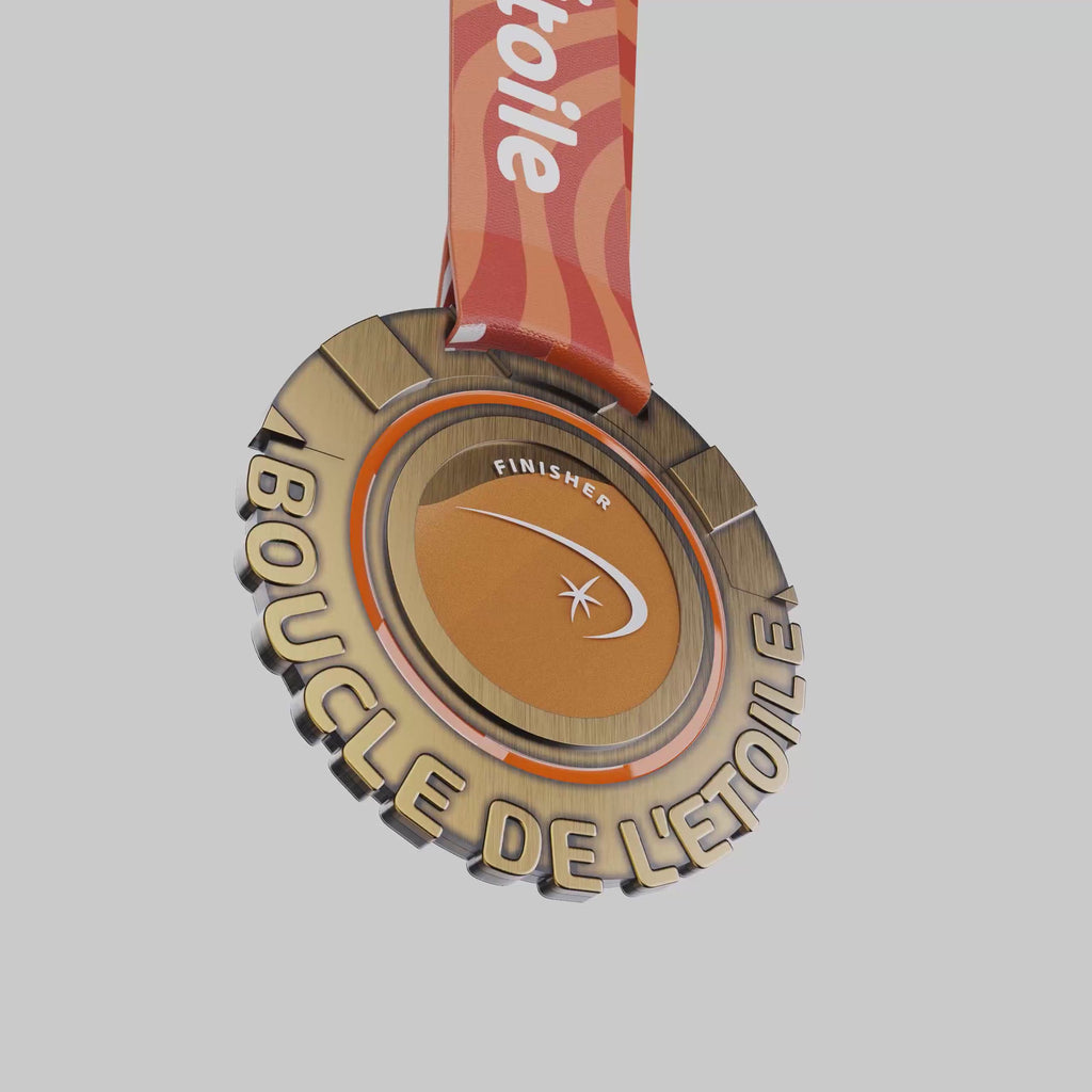 OOOVATION a conçu cette médaille en métal estampée et personnalisée pour la Boucle de l’Étoile. Élégante et moderne, elle se distingue par sa finition bicolore, ses reliefs travaillés et son ruban assorti aux teintes chaleureuses de l’événement.