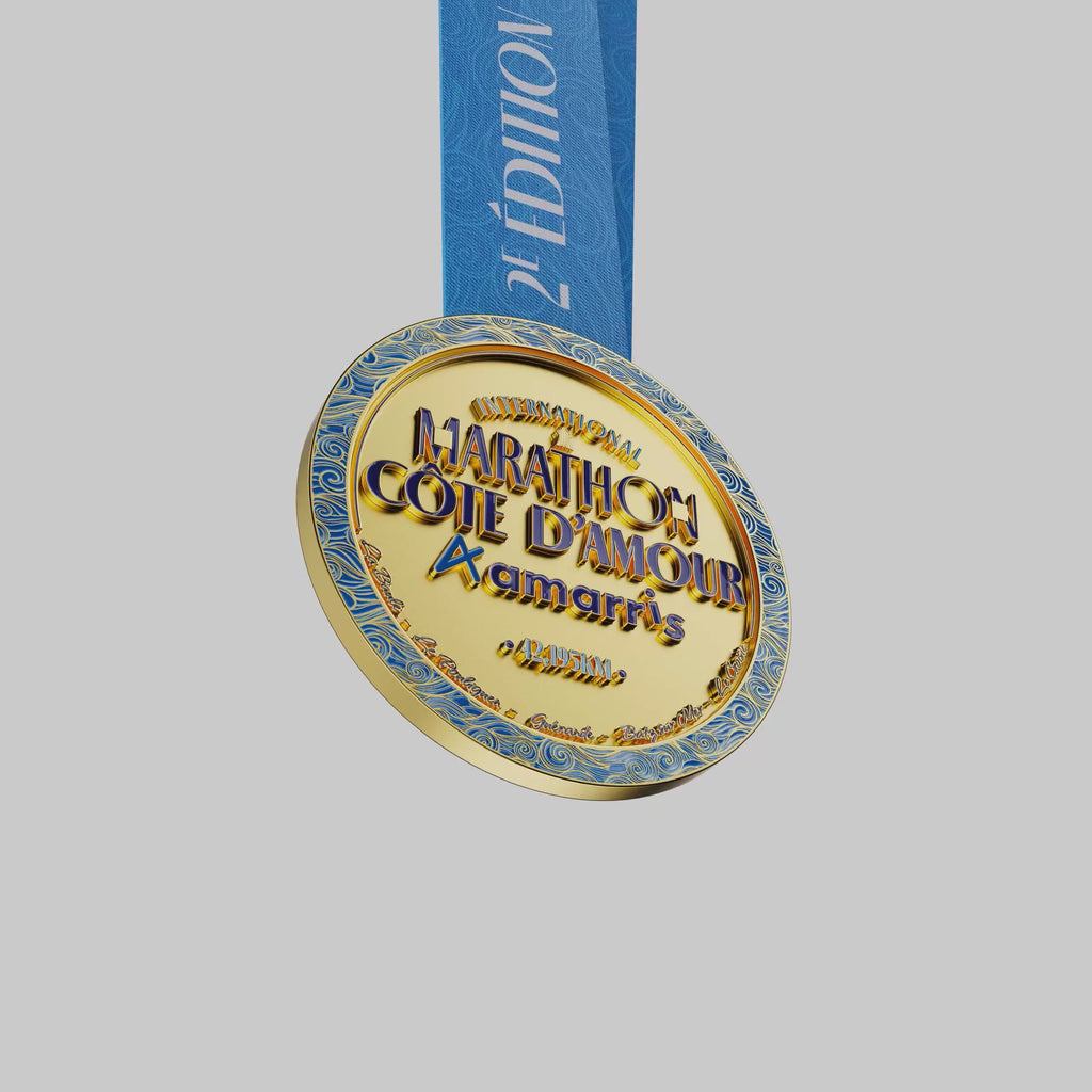 OOOVATION a conçu cette médaille en métal doré pour le Marathon International de la Côte d’Amour, un événement entre mer et lumière. Sa forme circulaire classique se distingue par une finesse d’exécution et un jeu de contrastes bleus et dorés évoquant la brillance des vagues atlantiques.