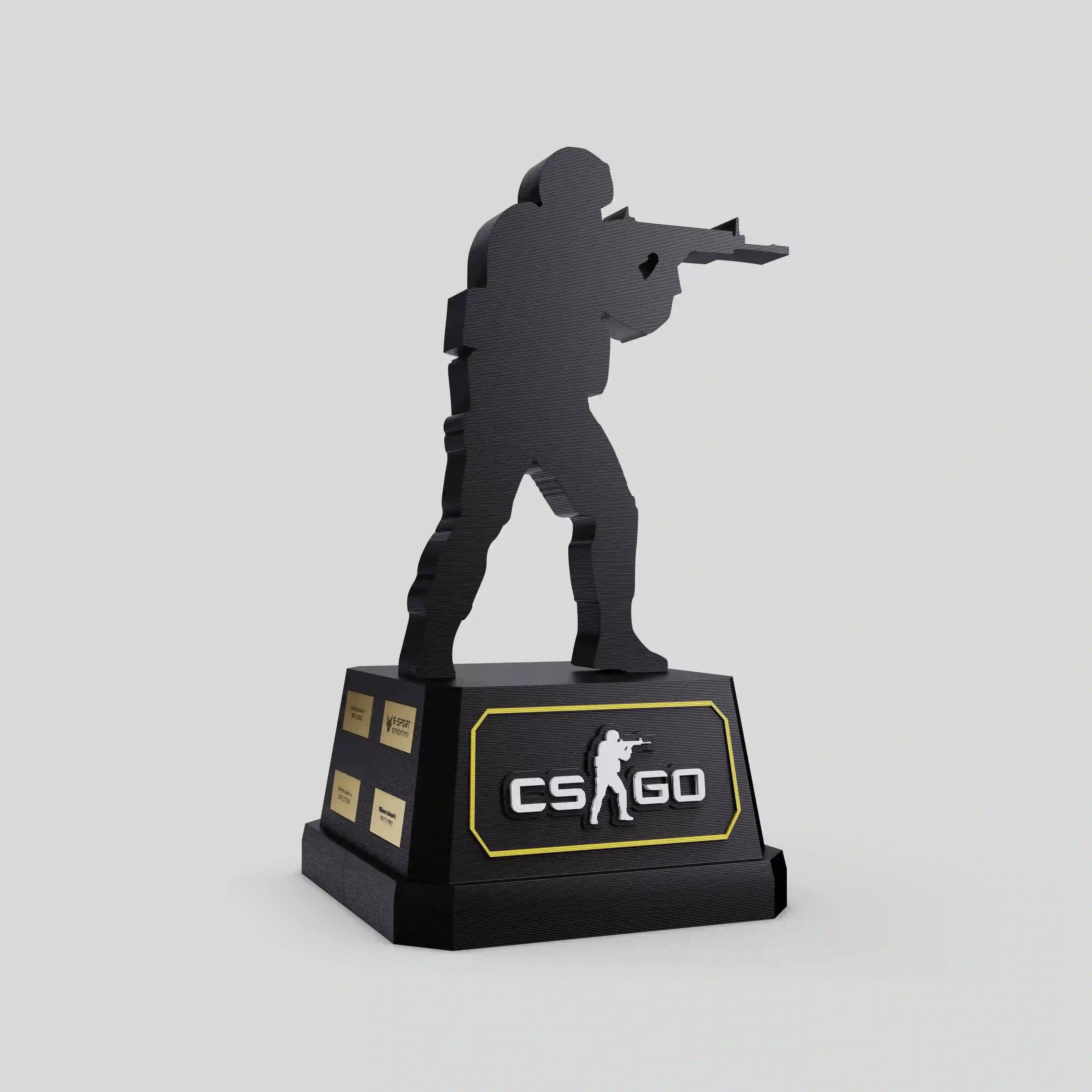 Conçu en impression 3D noire mate avec détails métalliques dorés et argentés, ce trophée associe modernité et réalisme. Le socle personnalisé au logo CSGO, adaptable à tout univers compétitif, incarne le savoir-faire OOOVATION dans la création de récompenses esport immersives et percutantes.