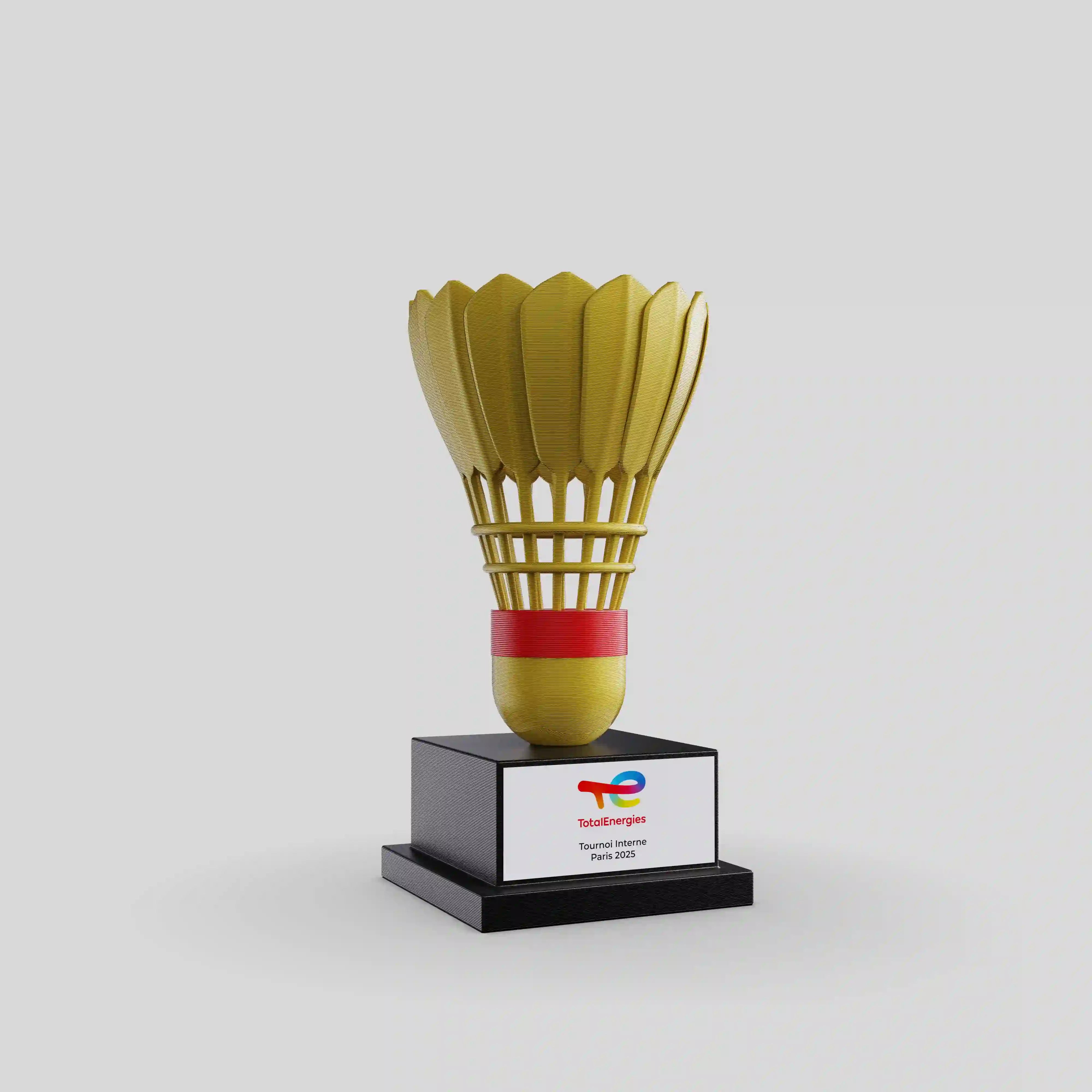 OOOVATION a conçu ce trophée en impression 3D dorée pour les Championnats du Monde de Badminton, une compétition emblématique réunissant l’élite mondiale de la discipline. Inspiré de la forme iconique du volant, il symbolise la précision, la vitesse et la légèreté propres à ce sport d’excellence.