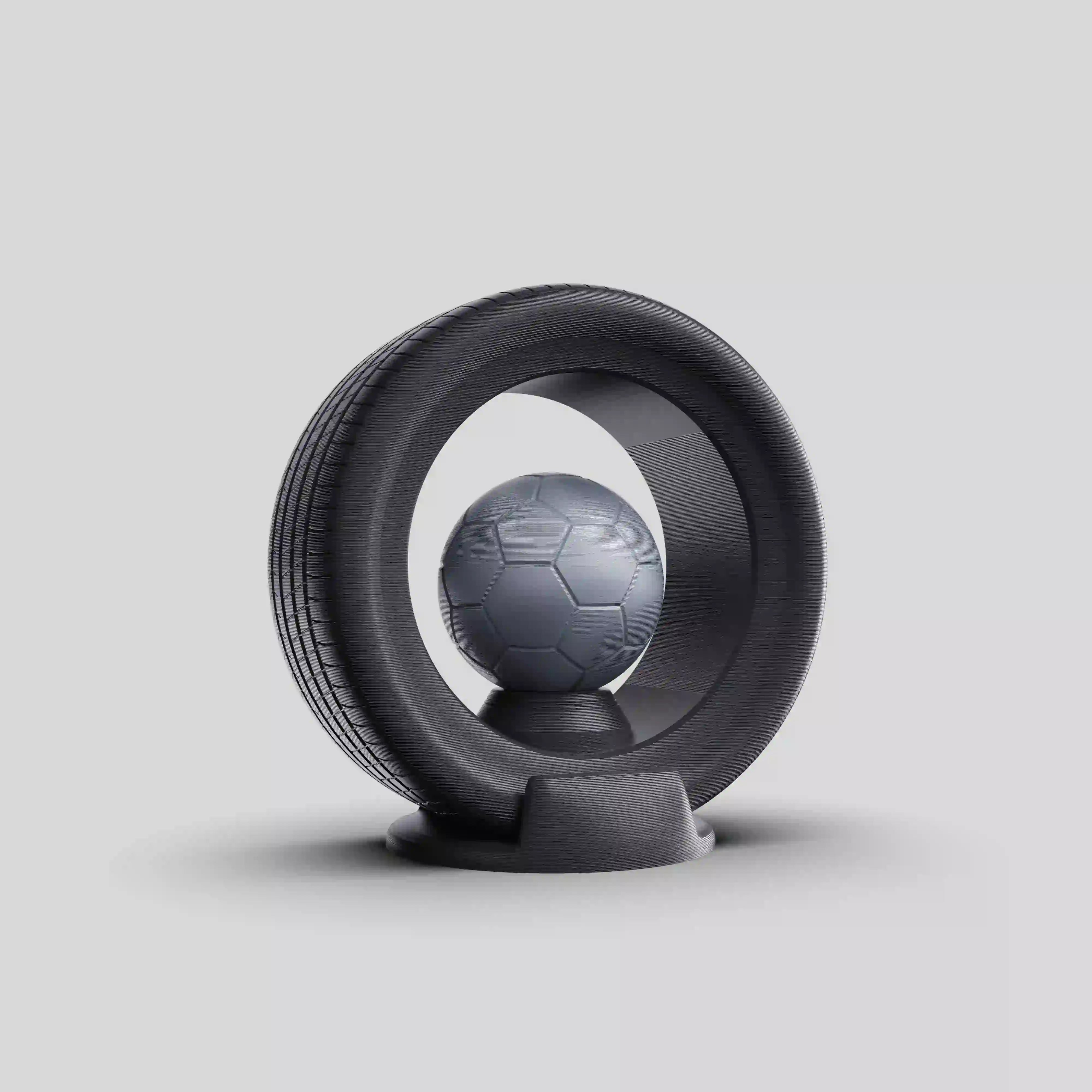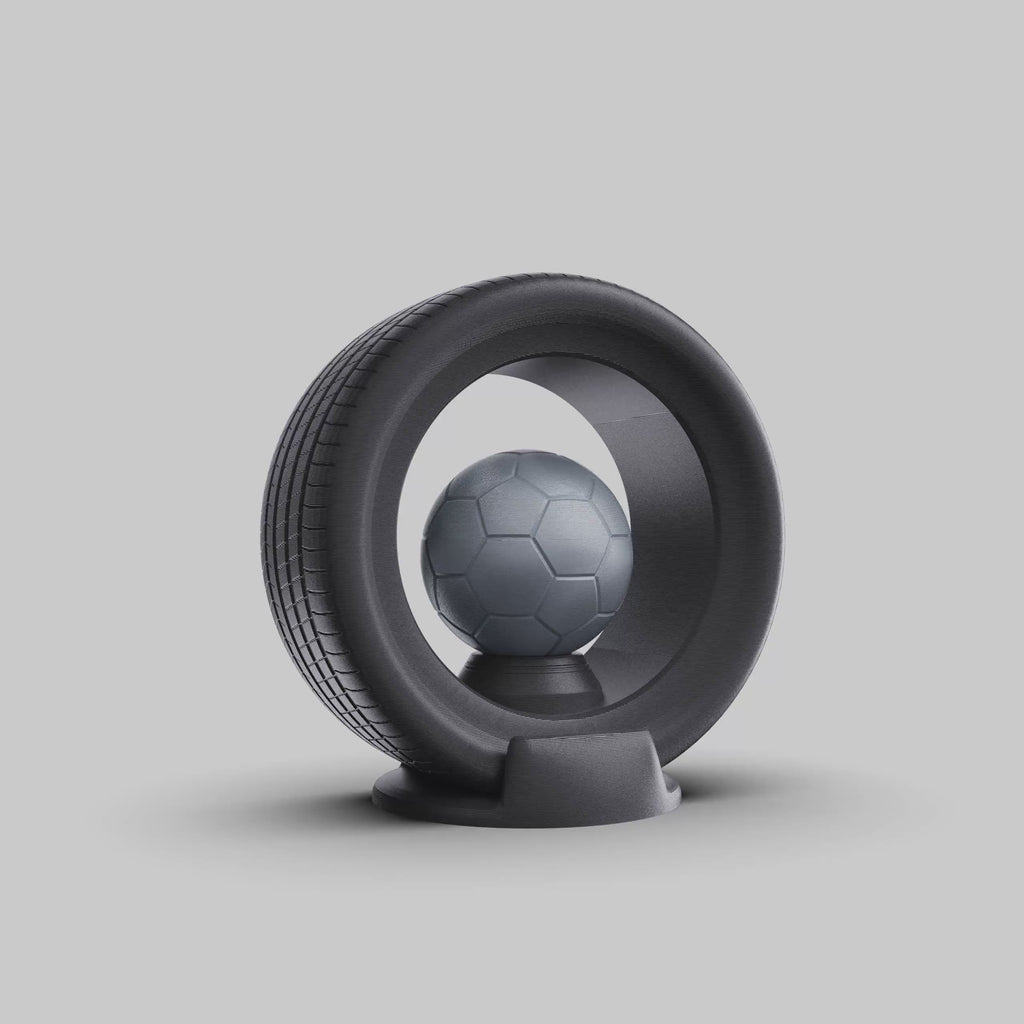 OOOVATION a imaginé ce trophée en impression 3D noire et argentée pour Racing Star, une compétition de football dans un contexte de Grand Prix. Son design audacieux, composé d’un pneu stylisé entourant un ballon métallique, symbolise la fusion entre vitesse, précision et compétition virtuelle.