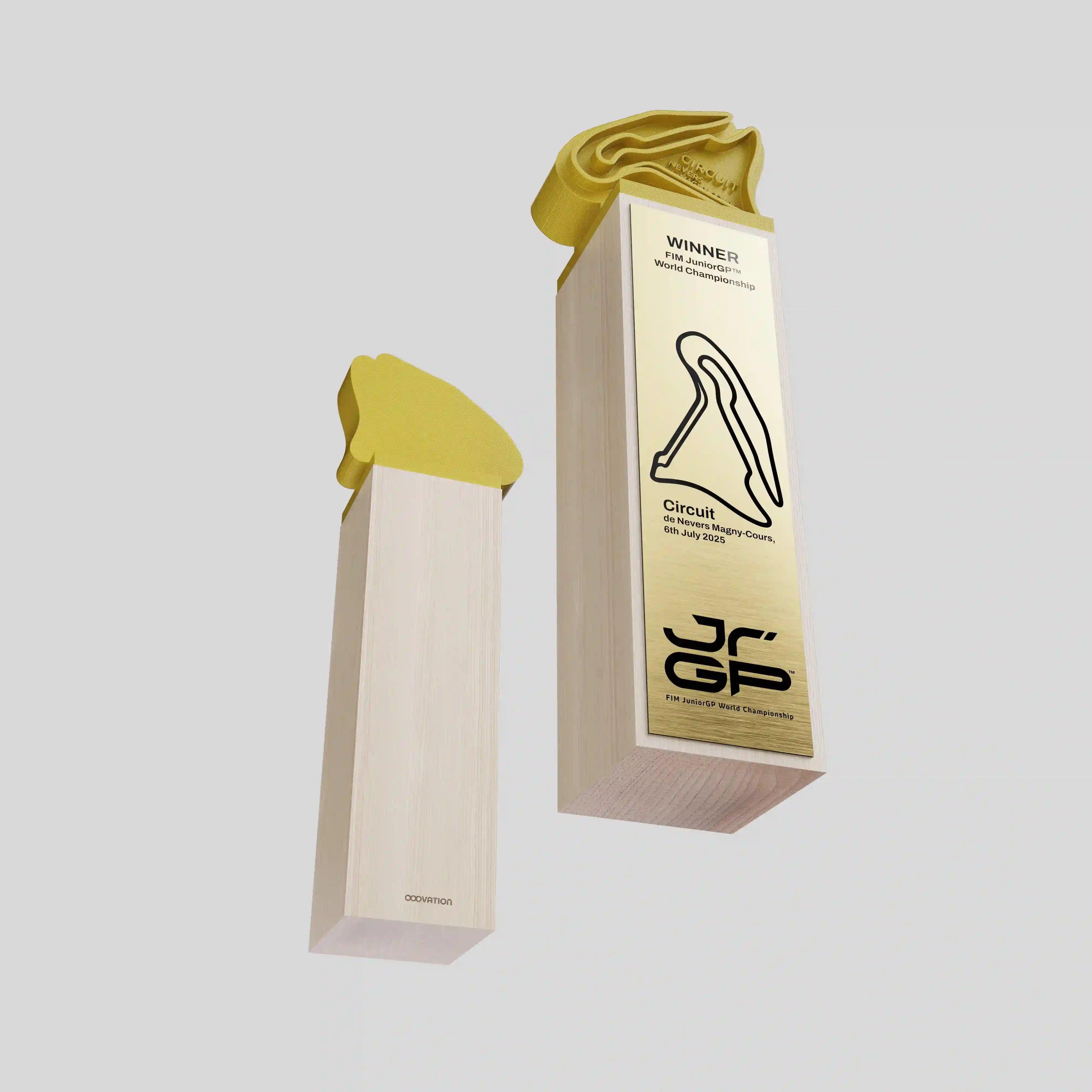 Conçu pour la manche française du Championnat du monde FIM JuniorGP 2025, ce trophée associe bois massif, plaque dorée et sommet en impression 3D.