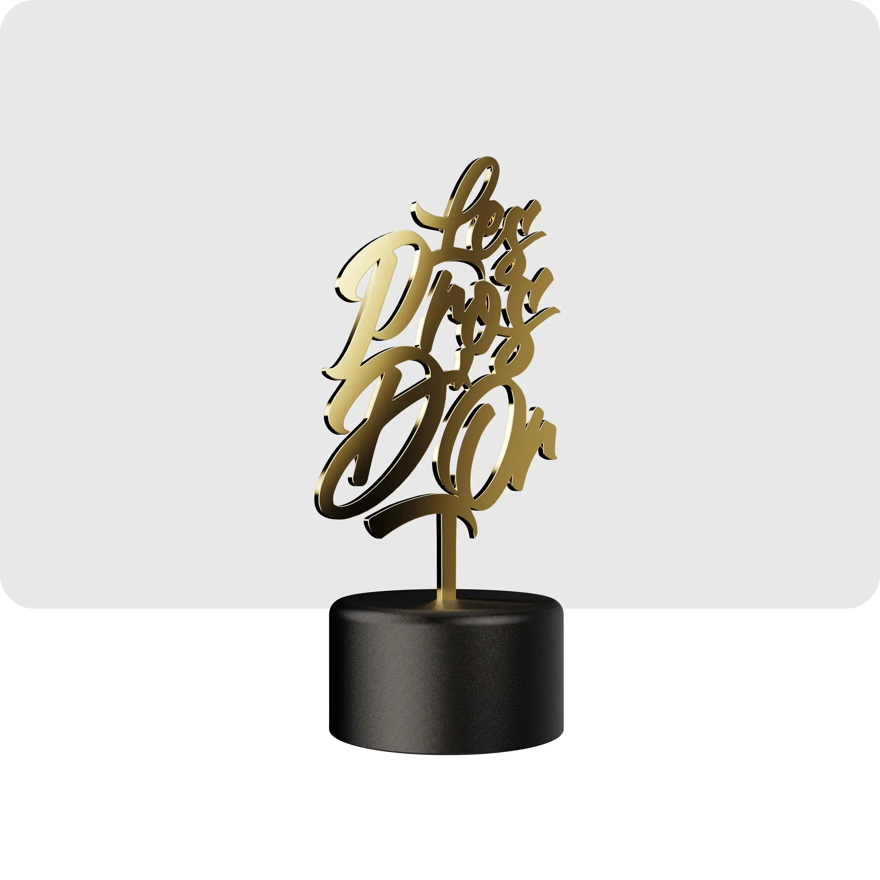 OOOVATION a conçu ce trophée en métal doré pour la cérémonie Les Pros d’Or, un événement qui récompense l’excellence et la créativité dans le monde de la communication et du marketing. Sculpté dans une typographie manuscrite élégante, il associe raffinement et modernité dans une pièce à forte identité visuelle.